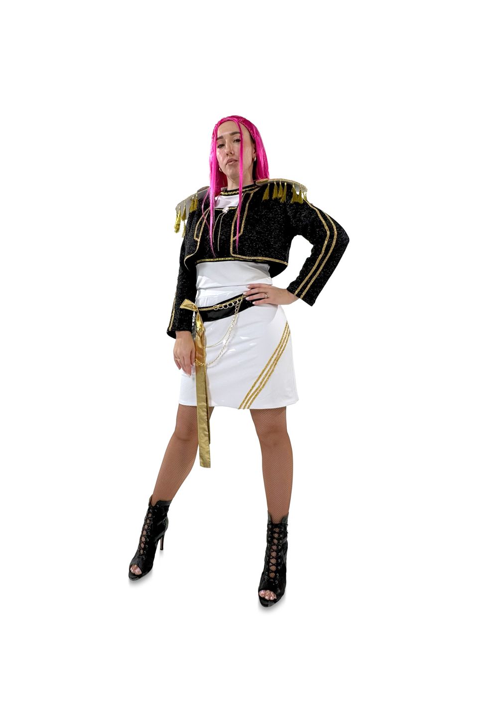 В состав карнавального костюма Мира входят: юбка-шорты, футболка, пиджак, пояс.