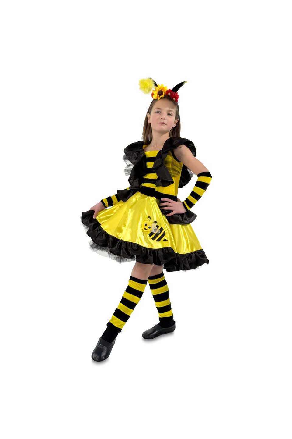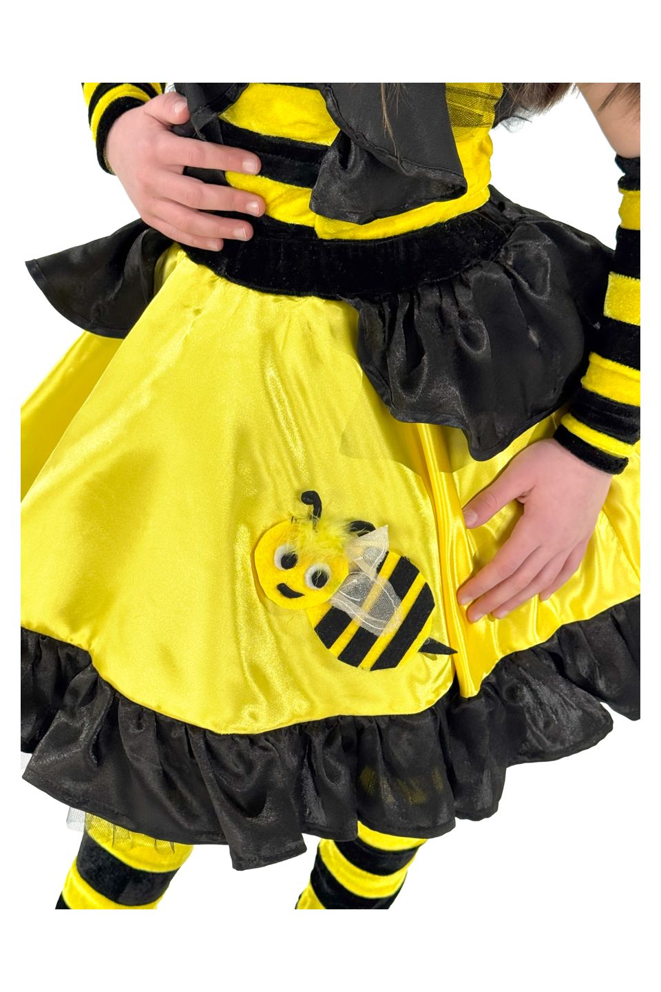 В состав карнавального костюма "Пчелка Медуница" входят: юбка, блузка с рюшами-крылышками, головний аксессуар с усиками, гетры, полосатые манжеты.