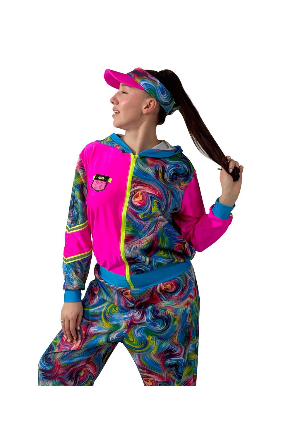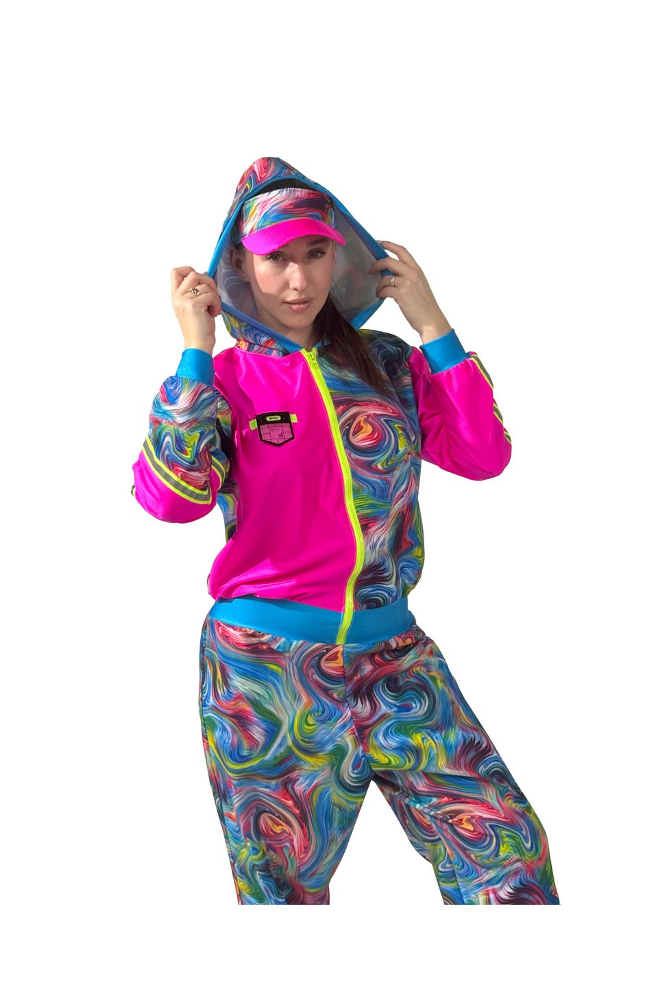 В состав карнавального цветного комбинезона входят: комбинезон, козырек.
