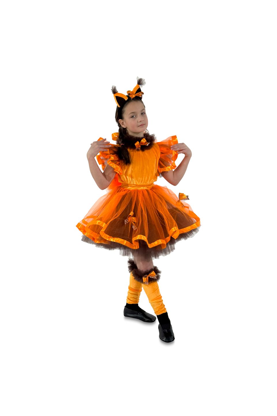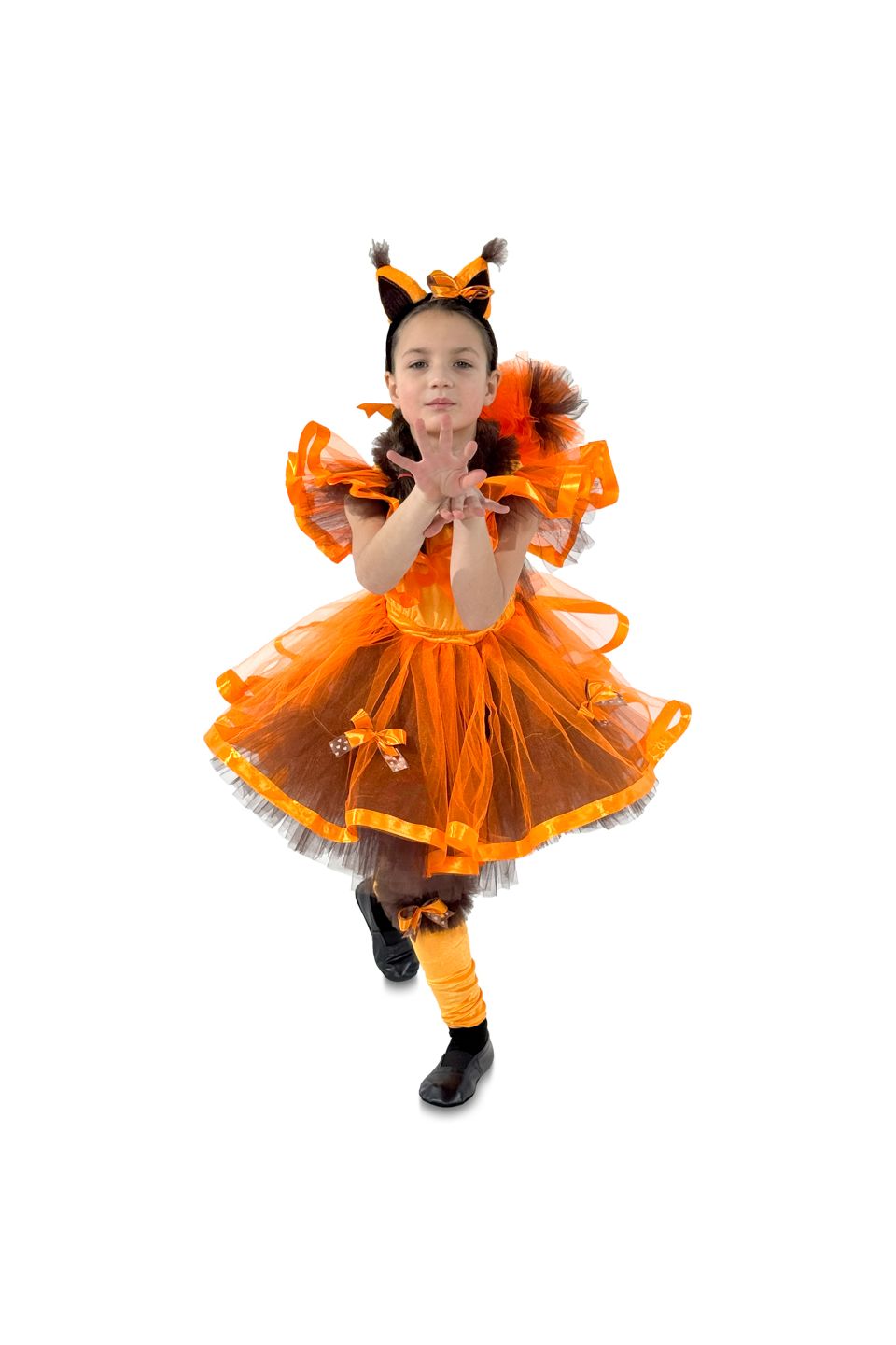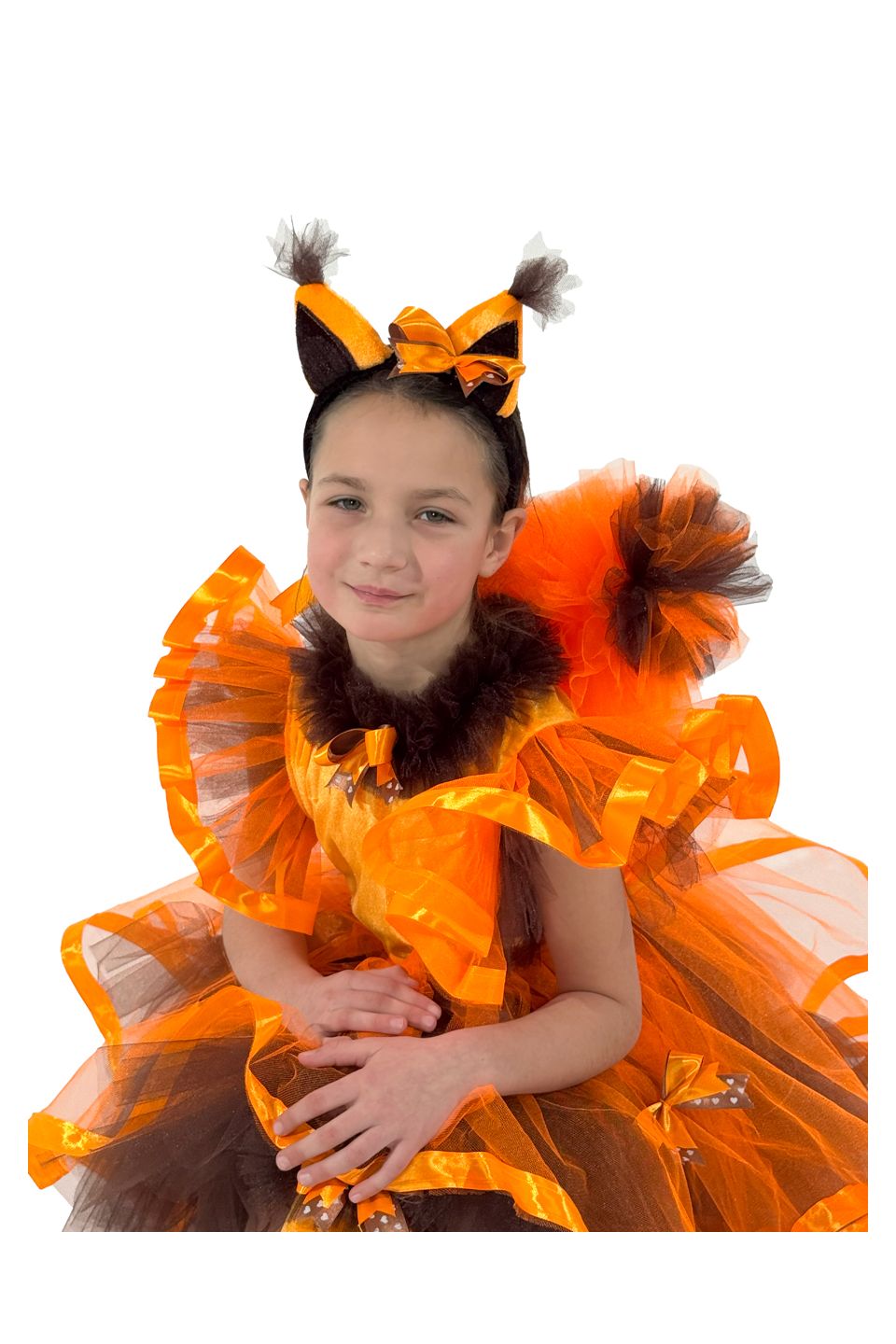 До складу карнавального костюма Білочка"Горіхова фея" входять: сукня з пухнастим хвостом, гетри ,головний аксесуар з вушками.